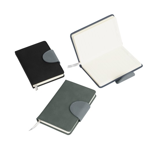 Caderneta com capa em couro sintético de acabamento aveludado, fecho magnético e marcador de páginas em fita de cetim. Possui cerca de 96 folhas marfim com pautas e espaço para assinalar dias da semana e datas numéricas. MEDIDAS: Altura : 14,2 cm. Largura : 9,9 cm. Profundidade : 2,3 cm. Peso aproximado (g): 132. GRAVAÇÃO: Silk screen 1 cor.