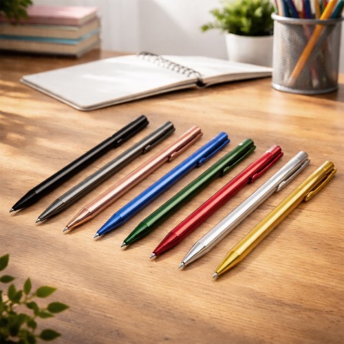 Caneta metálica com acabamento brilhante, acionamento por clique e carga esferográfica azul de 1,0 mm. MEDIDAS: Altura : 13,7 cm. Largura : 1,3 cm. Peso aproximado (g): 15. GRAVAÇÃO: Laser.