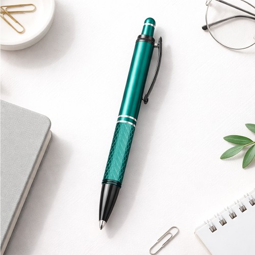 Caneta metálica com textura próximo à ponta, detalhes em plástico e acabamento emborrachado no topo para o uso em dispositivos com telas sensíveis ao toque. Conta ainda com acionamento por clique e carga esferográfica azul de 1,0mm. MEDIDAS: Altura : 13,9 cm. Largura : 1,6 cm. Peso aproximado (g): 19. GRAVAÇÃO: Laser.