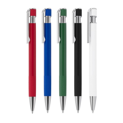 Caneta esferográfica com corpo em alumínio reciclado, acionador e clipe cromado, escrita em tinta azul. Refil substituível tipo Parker. GRAVAÇÃO: Laser.