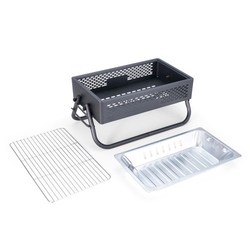 Churrasqueira em ferro com aberturas para ventilação e pés montáveis, que também podem ser utilizados como alças para transporte quando a churrasqueira não estiver em uso. Conta ainda com grelha em metal galvanizado e bandeja metálica com alças removíveis para acomodação do carvão. MEDIDS: Altura : 22,8 cm. Largura : 52,3 cm. Profundidade : 29,5 cm. Peso aproximado (g): 2051. GRAVAÇÃO: Laser.