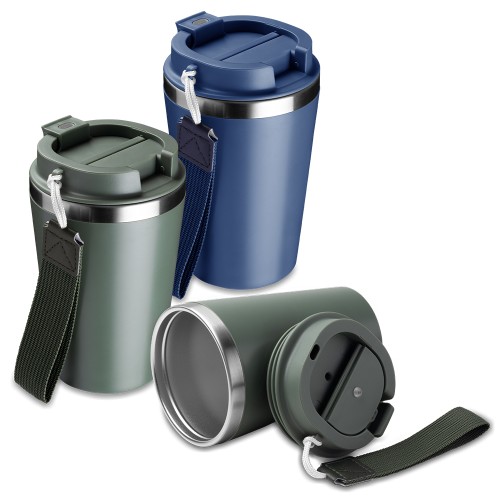 Copo de 350 ml com parede dupla, interior em inox 304 e exterior em plástico PP, tampa em plástico PP, alça de mão e acabamento com pintura fosca. GRAVAÇÃO: Laser.