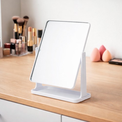 Espelho de mesa giratório retangular sem aumento. Possui estrutura em plástico e base com espaço para organizar pequenos objetos. MEDIDAS: Altura : 20,8 cm. Largura : 15,9 cm. Profundidade : 6,5 cm. Diâmetro : 22 cm. Peso aproximado (g): 158. GRAVAÇÃO: Tampografia 1 cor.