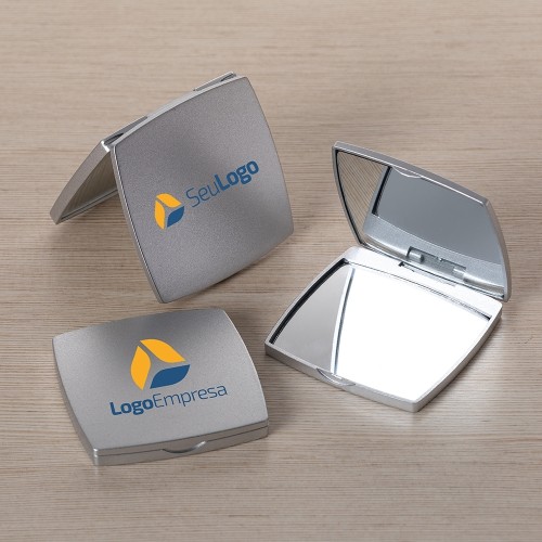 Espelho duplo sem aumento com moldura plana de bordas arredondadas feita em plástico. MEDIDAS: Largura : 6,7 cm. Comprimento : 6,7 cm. Espessura : 0,9 cm. Peso aproximado (g): 39. GRAVAÇÃO: Tampografia 1 cor.