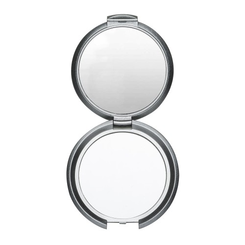 Espelho redondo duplo sem aumento, material em plástico resistente com superfície ondulada(área para gravação não é plana). MEDIDAS: Tamanho total aproximado: 7,1 cm x 7,1 cm. Peso aproximado (g): 36. GRAVAÇÃO: Tampografia 1 cor.