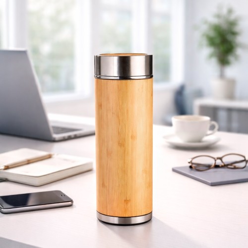 Garrafa térmica de parede dupla com revestimento externo em bambu e interior feito em inox 304. Possui capacidade de até 350ml, tampa rosqueável com detalhes externos em inox 201 e bambu e parte interna em plástico polipropileno (PP) com anel de silicone. Acompanha cesto infusor com alça em inox 304. MEDIDAS: Altura : 20,8 cm. Largura : 7 cm. Circunferência : 22 cm. Diametro : 6 cm. Peso aproximado (g): 295. GRAVAÇÃO: Laser.