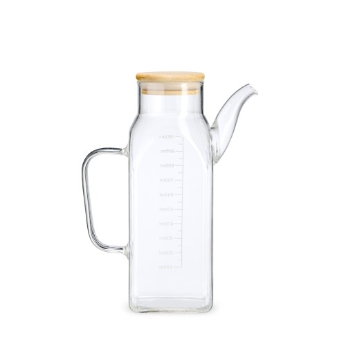 Jarra de vidro borossilicato, material resistente à oscilações de temperatura. Com capacidade para até 1 litro, possui marcação de capacidade no corpo do recipiente e tampa de bambu com anel de vedação. Acompanha tampa protetora para o bico em silicone. MEDIDAS: Altura : 23,1 cm. Largura : 18 cm. Peso aproximado (g): 392. GRAVAÇÃO: Laser.
