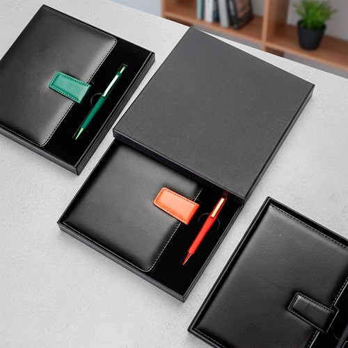 Kit executivo com duas peças, composto por uma caderneta de capa em couro sintético com fechamento magnético e cerca de 20 folhas pautadas, e uma caneta em metal com detalhes em plástico, ponteira emborrachada para uso em dispositivos touchscreen e carga esferográfica azul de 1,0 mm. Acompanha uma caixa de papelão com berço em espuma para a caneta. MEDIDAS: Largura : 21 cm. Profundidade : 2,7 cm. Comprimento : 22,5 cm. Peso aproximado (g): 462. GRAVAÇÃO: Silk screen 1 cor.