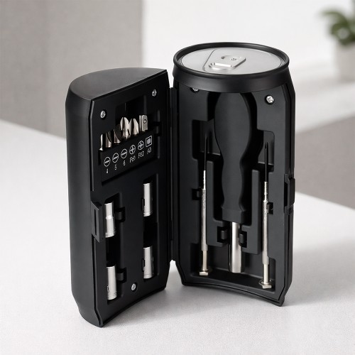 Kit de ferramentas com 13 peças em aço carbono. O conjunto conta com chave porta-bits magnética com cabo em polipropileno (PP), seis bits em formatos diferentes, sendo 3 de fenda, 2 Phillips e 1 adaptador para soquetes, além de duas chaves de precisão e 4 soquetes sextavados. Acompanha caixa plástica em formato de lata de bebida, com trava de fechamento. MEDIDAS: Altura : 14,2 cm. Largura : 7,2 cm. Peso aproximado (g): 253. GRAVAÇÃO: Tampografia 1 cor.