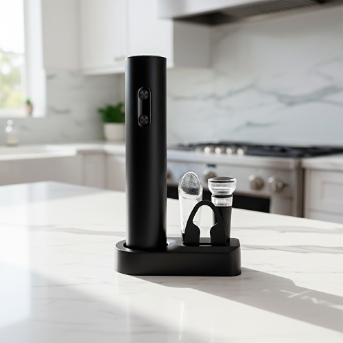 Kit vinho com cinco peças, incluindo: saca-rolhas em plástico e aço carbono com acionamento por botões alimentado por quatro pilhas AA (não inclusas), bico dosador e rolha em plástico e borracha TPR, cortador de lacre e base em plástico. MEDIDAS: Altura : 22,5 cm. Largura : 4,5 cm. Circunferência : 14 cm. Peso aproximado (g): 376. GRAVAÇÃO: Laser.