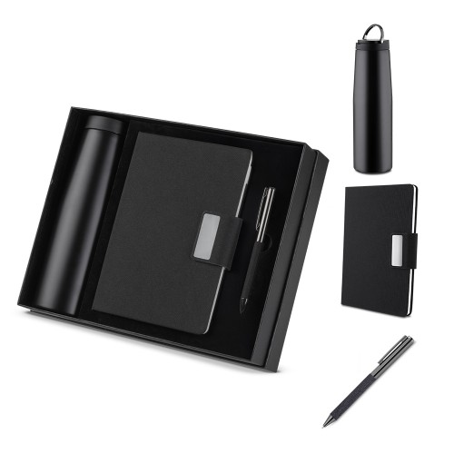 Kit Escritório Caderno, Garrafa e Caneta Metalica