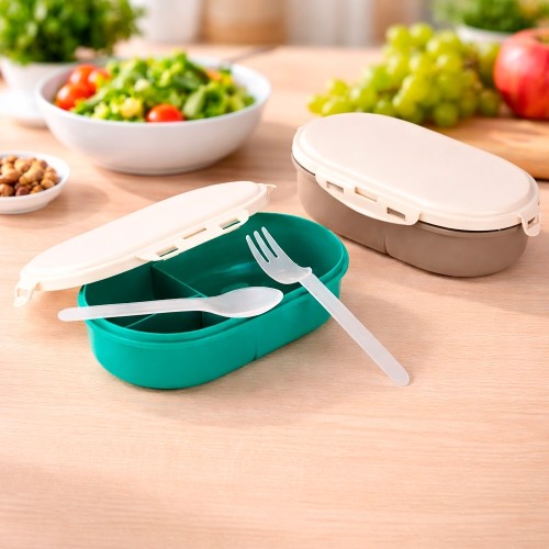 Marmita em plástico polipropileno (PP) livre de BPA com capacidade máxima de 900ml. Possui formato oval e tampa com quatro travas laterais para fechamento e três divisórias fixas. Acompanha colher e garfo em PP. OBS: Capacidade de 750ml quando enchida até o limite das divisórias MEDIDAS: Altura : 6,3 cm. Largura : 23,4 cm. Profundidade : 12,1 cm. Peso aproximado (g): 115. GRAVAÇÃO: Silk screen 1 cor.