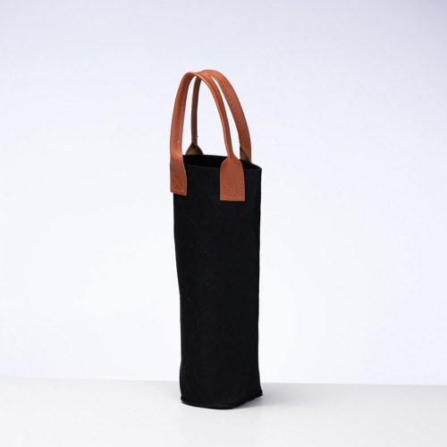 Sacola porta-vinho confeccionada em feltro e alças de mão em couro sintético. MEDIDAS: Altura : 30 cm. Diametro : 9,5 cm. Peso aproximado (g): 55. GRAVAÇÃO: Silk screen 1 cor.