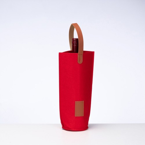 Sacola porta-vinho confeccionada em feltro com alças de mão e plaquinha retangular frontal em couro sintético. MEDIDAS: Altura : 31 cm. Largura : 15,5 cm. Diametro : 9 cm. Peso aproximado (g): 46. GRAVAÇÃO: Silk screen 1 cor.