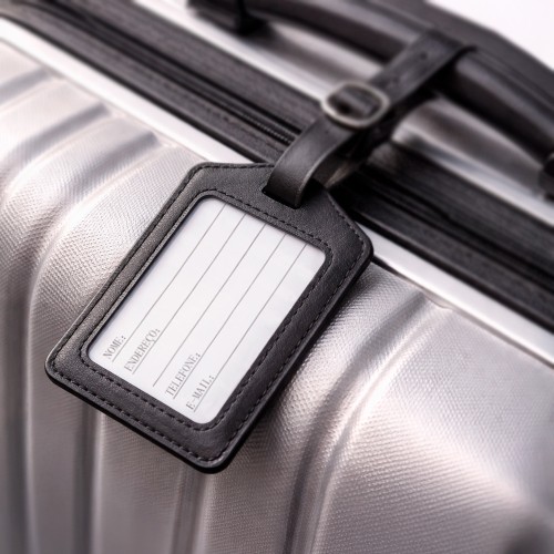 Tag identificadora para bagagem confeccionado em couro sintético. Possui visor em plástico transparente e etiqueta em papel cartão no tamanho 5,5 x 8,5 cm para o preenchimento de dados pessoais, além de alça com fivela metálica e cinco níveis de ajuste. MEDIDAS: Altura : 7 cm. Largura : 11 cm. Comprimento : alça 21,6 cm. Espessura : 0,3 cm. Peso aproximado (g): 12. GRAVAÇÃO: Silk screen 1 cor.